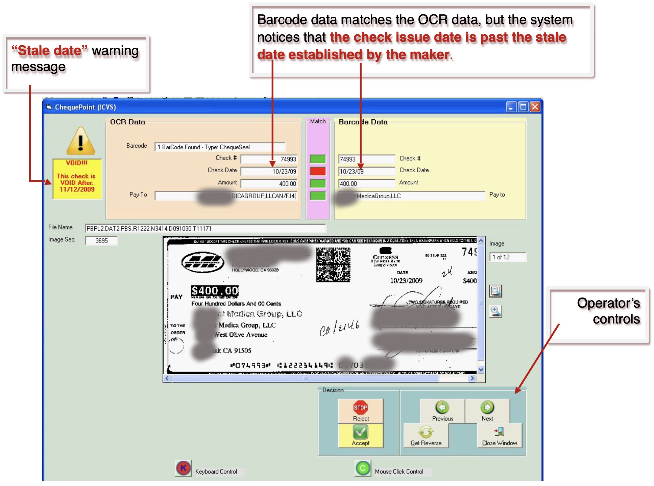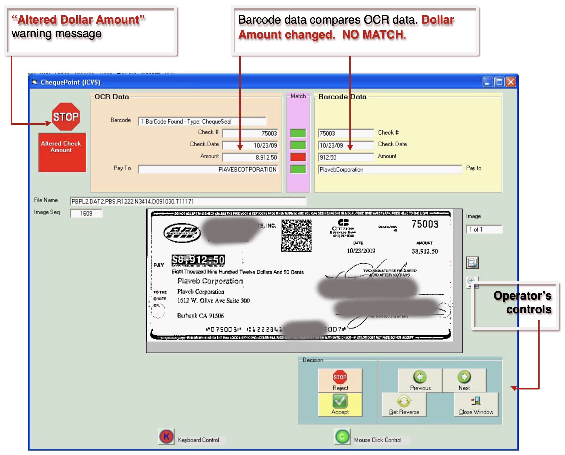In the back office: When a check is deposited, the encrypted seal is read and automatically compared with the data on the check image. If there is a discrepancy, the suspect items are flagged and the check images and data are displayed within the ChequePoint exception summary.